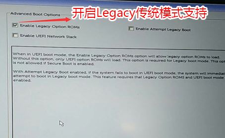 3、切换到Advanced Boot Options将右边的Enable legacy option roms选项打勾,如下图所示;