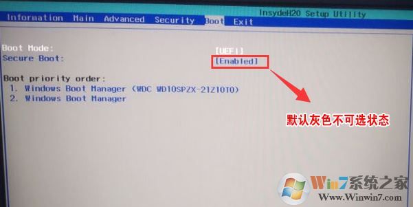 1、开机一直按F2进入BIOS,按F2进入BIOS界面,选择BOOT项后发现secure boot灰色不可选状态,如下图所示;