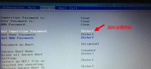 2、如果Secure Boot灰色无法设置,则转到Security,选择Set Supervisor Password回车设置密码,再返回BOOT选项,将Secure BOOT默认enabled为disabled,(注:改完secure boot后再设置密码为空即可,要不每次进BIOS都要设置)如下图所示;