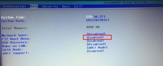 4、转到Main,选择F12 Boot Menu回车,设置为Enabled,按F10选择Yes回车保存修改,如下图所示;