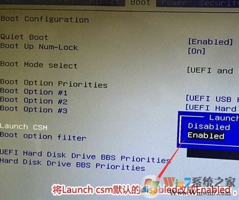 3、再将launch csm设置为Enabled,开启兼容模式,如下图所示,然后再F4保存设置,如图: