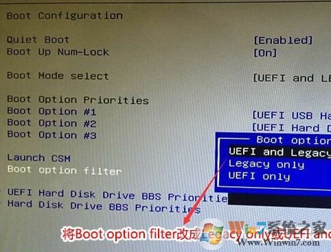 2、重启后再按delete,进入选择Boot选项,将Boot option filer回车设置成legacy only或uefi and legacy,如图: