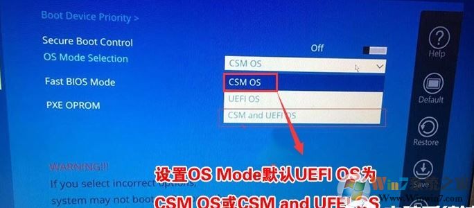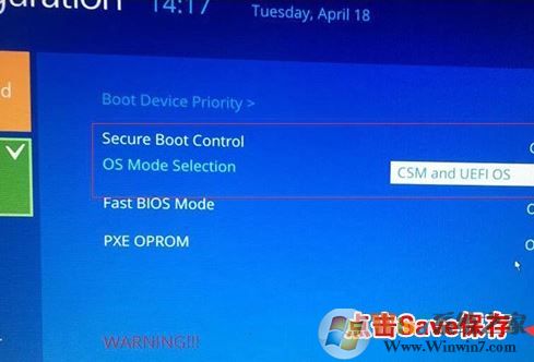 3、关闭安全启动后,BOOT选项中就会多出一个OS Mdoe Selection选项,我们将默认的UEFI OS改为CSM OS或CSM and UEFI OS,如下图所示;