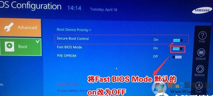 4、将Fast BIOS Mode后面的开关关掉(On变成Off),如下图所示;