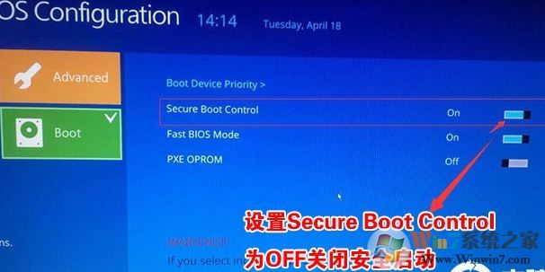 2、切换到BOOT的选项,将Secure Boot Control后面的开关关掉(On变成Off),关闭安全启动,该步是改WIN7的重要一步,如下图所示;