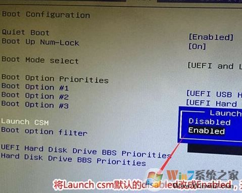 3、再将launch csm设置为Enabled,开启兼容模式,如下图所示,然后再F4保存设置,如图:
