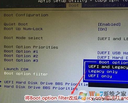 2、重启后再按delete,进入选择Boot选项,将Boot option filer回车设置成legacy only或uefi and legacy,如图: