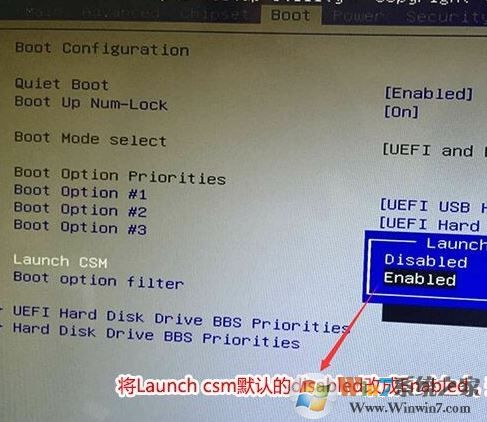 3、再将launch csm设置为Enabled,开启兼容模式,如下图所示,然后再F4保存设置;
