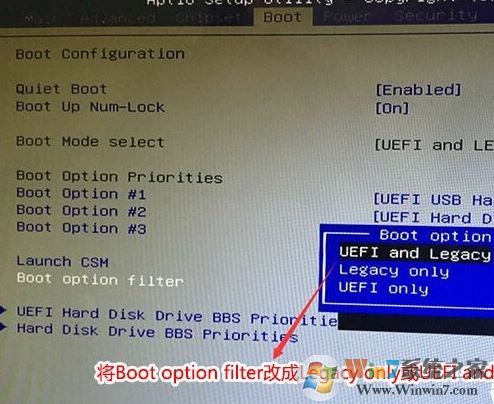 2、重启后再按delete,进入选择Boot选项,将Boot option filer回车设置成legacy only或uefi and legacy,如下图所示;