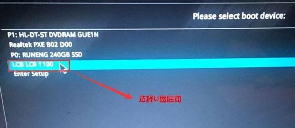 5、插入U盘启动盘,重启按ESC选择识别到U盘启动项,按下回车键: