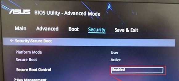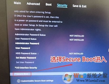 2、进入高级模式后,按→方向键移动到Security,选择Secure Boot,然后回车进入把Secure Boot control选enabled改为disabled关闭安全启动,装win7必须关闭安全启动,如下图所示;