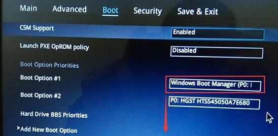 4、继续把boot option#1选项改为普通引导的,boot option#1和boot option#2硬盘启动位置对换,设置第一启动项为普通硬盘引导,带Windwos Boot Manager的为UEFI引导分区,然后按F10保存设置;
