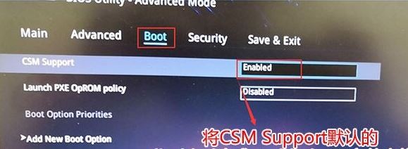 3、再切换到BOOT的选项,把CSM support由disabled改成enabled,开启兼容模式,如图所示: