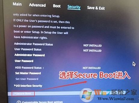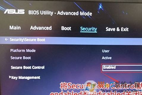 2、进入高级模式后,按→方向键移动到Security,选择Secure Boot,然后回车进入把Secure Boot control选enabled改为disabled关闭安全启动,装win7必须关闭安全启动,如图所示: