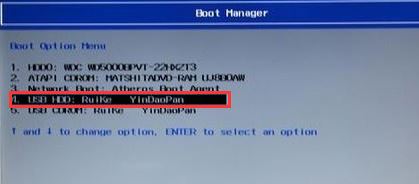 4、插入U盘启动盘,重启时不停的按下f12,打开Boot Manager,选择USB HDD回车从U盘启动,如下图所示;