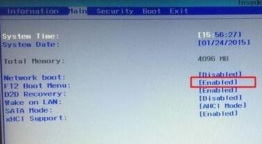 3、转到Main,选择F12 Boot Menu回车,设置为Enabled,按F10选择Yes回车保存修改,如下图所示;
