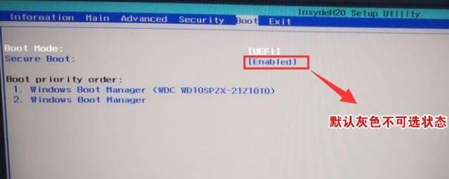 1、开机一直按F2进入BIOS,按F2进入BIOS界面,选择BOOT项后发现secure boot灰色不可选状态,如下图所示;