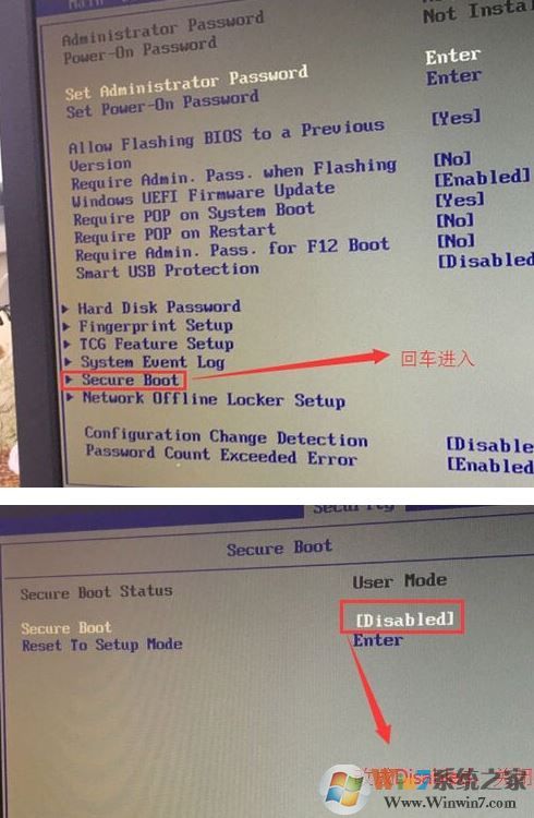 1、开机一直按F2或(FN+F2)进入BIOS,按→方向键切换到Security,选择Secure Boot回车设置成Disabled;