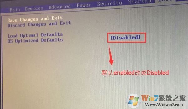 2、转到Exit,把OS Optimized Defaults设置为Disabled,改成支持win7系统模式,如下图所示;