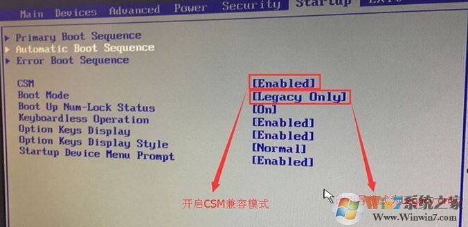3、切换到Boot,把Boot Mode从UEFI改成Legacy only引导模式,再把csm默认disabled改成enabled,开启兼容模式,选择F10保存设置,在弹出的选项中选择YES;