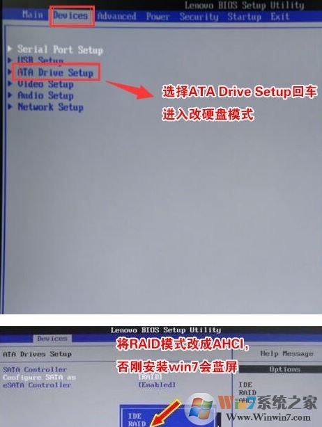 4、切将键盘移动Devices选项,把键盘移动ATA Drive Setup回车,将configure SATA as中默认的raid改成ahci模式,否则安装win7时会出现0x0000007b蓝屏,因为win7中没有集成raid硬盘驱动,然后选择F10保存设置,在弹出的选项中选择YES,如下图所示;