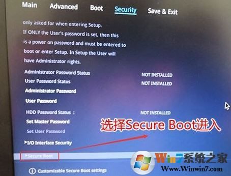 2、进入高级模式后,按→方向键移动到Security,选择Secure Boot,然后回车进入把Secure Boot control选enabled改为disabled关闭安全启动,装win7必须关闭安全启动,如图: