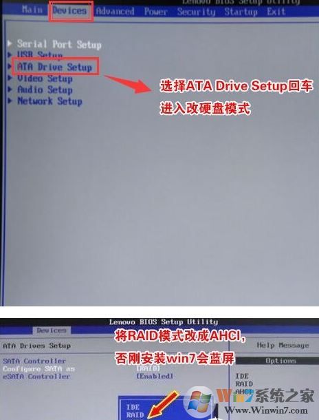 4、切将键盘移动Devices选项,把键盘移动ATA Drive Setup回车,将configure SATA as中默认的raid改成ahci模式,否则安装win7时会出现0x0000007b蓝屏,因为win7中没有集成raid硬盘驱动,然后选择F10保存设置,在弹出的选项中选择YES,如下图所示;