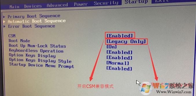 3、切换到Boot,把Boot Mode从UEFI改成Legacy only引导模式,再把csm默认disabled改成enabled,开启兼容模式,选择F10保存设置,在弹出的选项中选择YES;