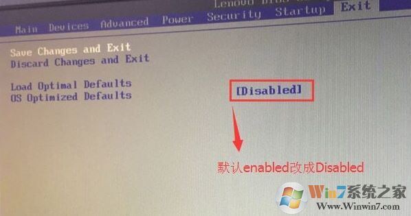 2、转到Exit,把OS Optimized Defaults设置为Disabled,改成支持win7系统模式,如下图所示;