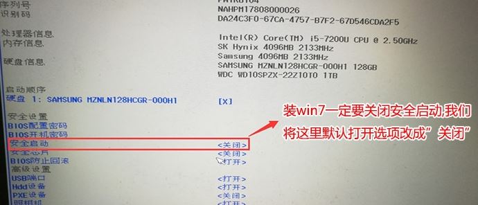 3、选然后我们再将键盘往下移动,将安全启动(Secure Boot)由默认的打开(enabled)状态改成关闭(disabled),如下图所示: