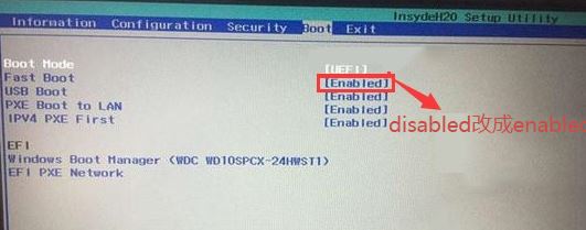4、切换到Boot,把Fast Boot从Disabled改成Enabled,开启快速启动设置U盘启动,如图: