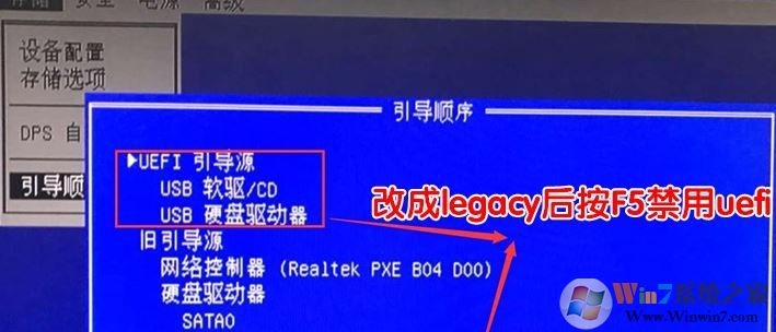 3、然后进入存储选项,然后选择引导顺序,如果我们改成legacy旧支持后,这里进入后按F5禁用uefi引导源,如下图所示;