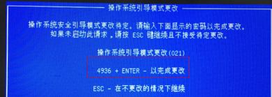 5、主机自动重启,开机显示操作系统引导模式更改,中间有四个随机数字加回车,例如下图:4936+ENTER,需要敲击显示的四个数字后按Enter键,否则之前更改的信息无法保存。(敲击数字前需要确认小键盘是否已开启,开启后再敲击,或者请按大键盘字母上面的一排数字键输入);
