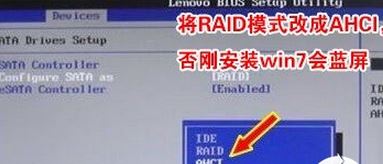 3、切将键盘移动Devices选项,把键盘移动ATA Drive Setup回车,将configure SATA as中默认的raid改成ahci模式,否刚进PE后有可能认不到硬盘,然后选择F10保存设置,在弹出的选项中选择YES,如下图所示;