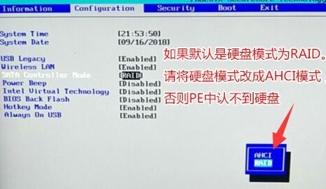 5、注意:再返回configuration这项,查看sata controller mode这项,如果默认硬盘模式为RAID,请将硬盘模式改为AHCI模式,否则进PE后不能认出硬盘,如果更改后记得按F10保存,如图所示: