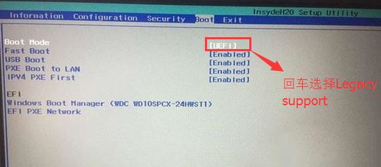 3、切换到Boot,把Boot Mode从UEFI改成Legacy Support传统引导,部分机器也可以采用uefi安装,但保险点还是改成传统模式,如下图所示;