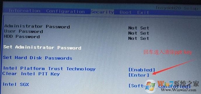 注:按如果Security选项下没有Secure Boot选项,看下是否有"clear intel PTT Key"选项,如果有进入回车选选择“yes”清除ppt key,否则无法安装系统后无法引导启动,如下图所示;