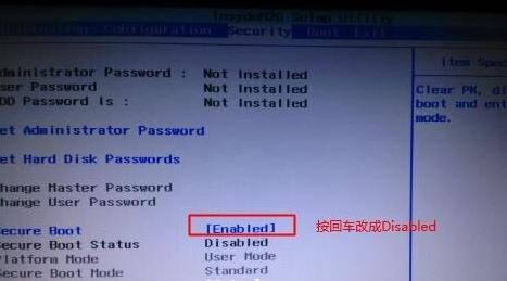 1、开机一直按F2或(FN+F2)进入BIOS,按→方向键切换到Security,选择Secure Boot回车设置成Disabled,其中文意思是关闭“安全启动”,如果不关闭此选项,哪怕安装上WIN7也启动不了,如图所示: