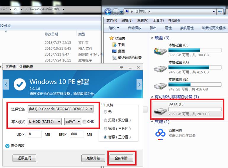 2、然后进入下面的窗口,选择目标优盘,所有参数都是默认值,点击全新制作(为了方便,也可以把这个PE安装到磁盘本地,我们后面会讲)