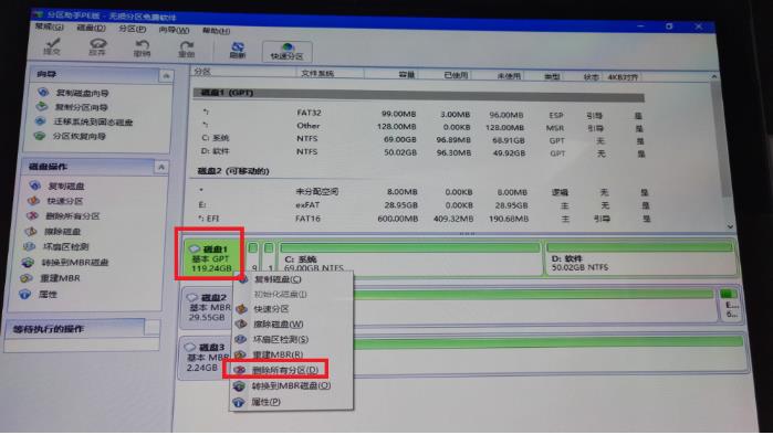 1、进入系统之后首先用无损分区工具格掉原来的所有硬盘(微软默认会保留系统修复的几个G的空间,而且C盘很大,这个都是不合理的)