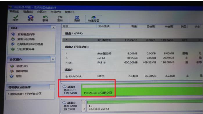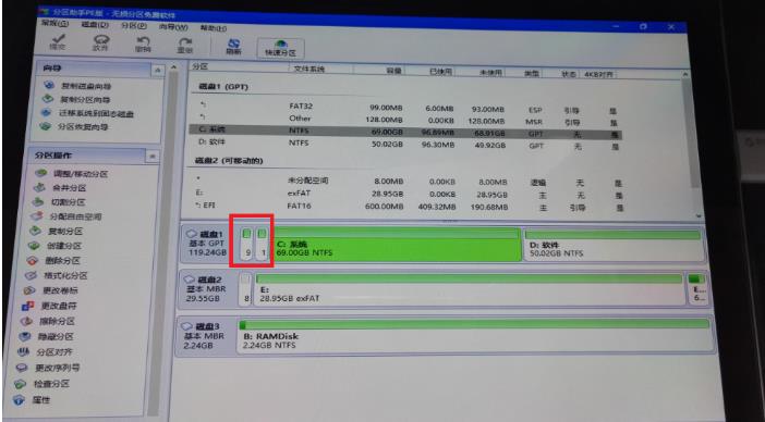 4、这是快速自动分区之后的效果,还是会自动产生一两个没有盘符的分区,这些是存放引导信息的(GPT的磁盘就这样,不用管它)
