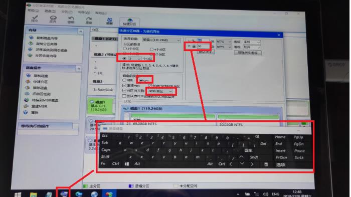 3、然后快速重建分区(还是保留GPT的方式),一般只需要两个分区,C盘要稍微大一点(默认的30G是不够的),注意你为了输入数字,需要点开底部任务栏的屏幕键盘,然后定位到下一个分区(比如D盘)大小的文本框,输入小一点的数字,比如50G,则C盘会自动计算为新的数值。注意分区对齐设置为4096扇区,然后点击执行