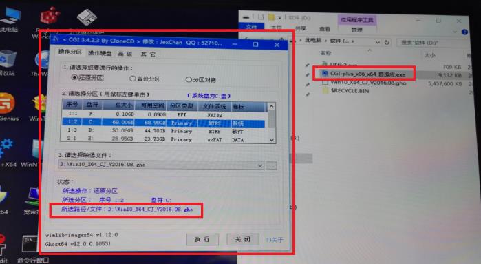 1、把之前U盘上的GHO文件和一些工具都复制到非系统盘(比如D盘),然后双击CGI-plus_x86_x64自适应,然后默认已经给你设置好了,从D盘的Ghost文件,恢复到C盘,直接执行即可