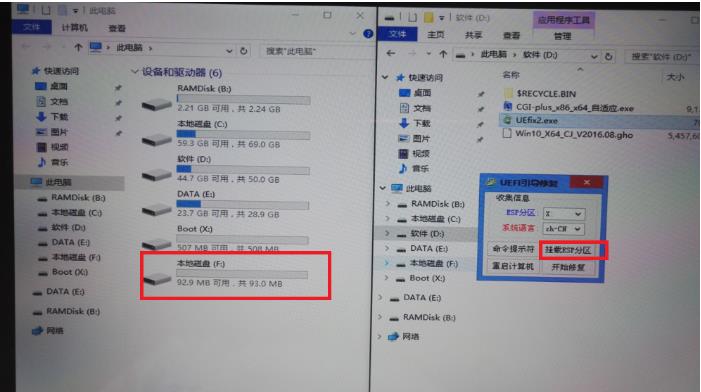 3、然后可以ESP分区选择刚才挂在的F盘(这个默认是没有盘符的,必须挂在才会显示,大小就是93M左右),然后点击开始修复(会弹出窗口要求找到C盘的Windows目录)