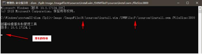 //命令中的第一个@改为win10镜像虚拟光驱的盘符,第二个@改为U盘盘符。 //运行命令,等待大概10来分钟即可(取决于U盘写入速度)。 dism /Split-Image /ImageFile:@:\sources\install.wim /SWMFile:@:\sources\install.swm /FileSize:3800