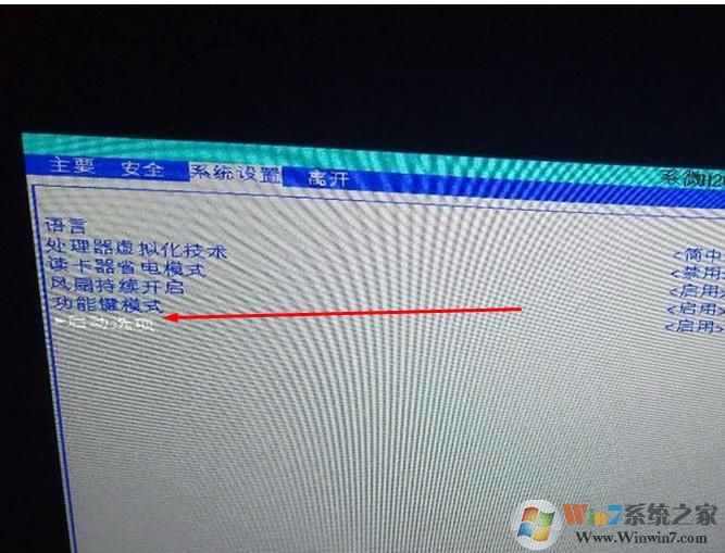 2、进入BIOS后可以通过键盘上的方向键和Enter键选择,在BIOS后在顶部菜单栏选择第三项“系统设置”,在“系统设置”的下面选择“启动选项”,如下图所示