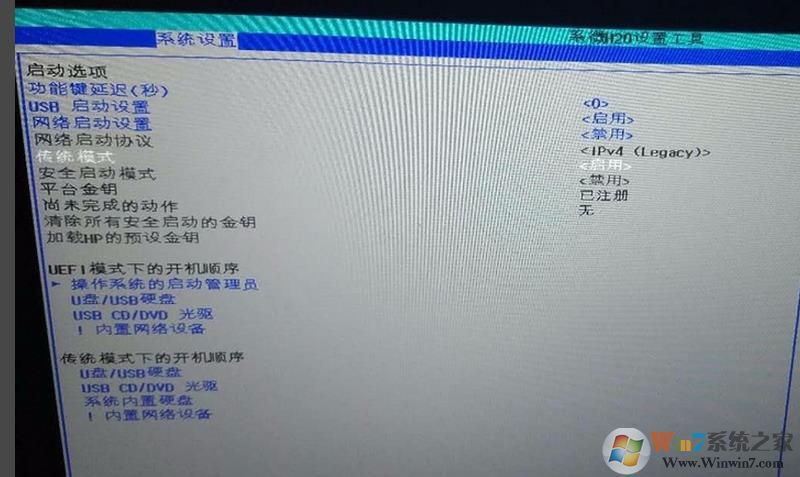 3、在启动选项里有一个“传统模式”默认是禁用的,把它改成启用,并且把“传统模式下的开机顺序”下面的“U盘/USB硬盘”通过键盘调到第一个(F5向上/F6向下移动),如下图所示。修改完成后记得按“F10”保存并退出。