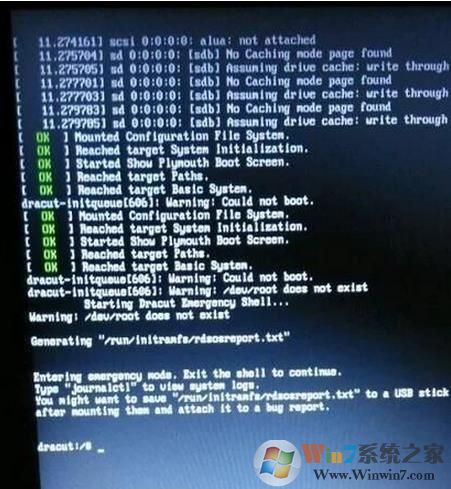 如果制定不正确就会出现下面类似的图片,相关的解决办法可以google(centos 7 dracut:/#)。