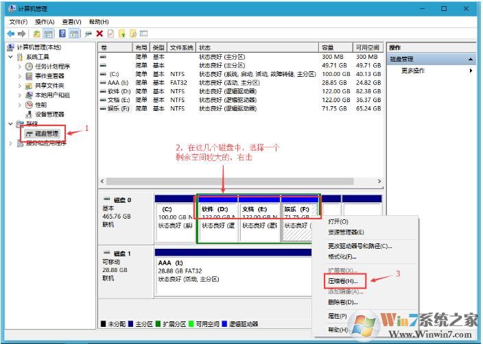 2、在计算机管理中,打开磁盘管理,如下图; 右键点击一个空间比较大的磁盘,选择压缩卷;