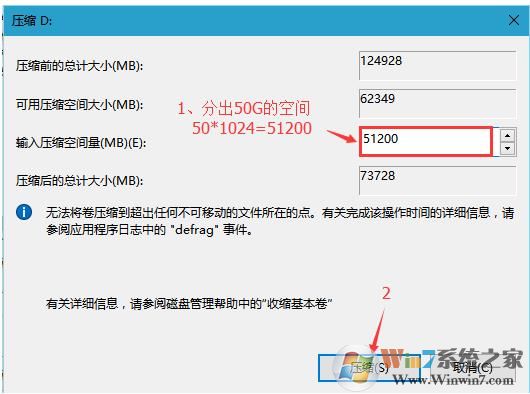 3、输入一个合适的空间大小,点击压缩。(从可用磁盘中分一外区出来安装CentOS)
